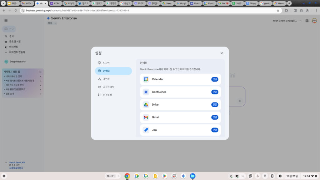 또한 최초로 Gemini Business에 접속하게 되면 아래와 같이 내가 가진 Data소스에 연결하는 커넥터 메뉴가 나옵니다. 현재 연결할 수 있는 커넥터는 Calendar, Confluence, Drive, Gmail, Jira, OneDrive, Outlook, Sharepoint가 있습니다.