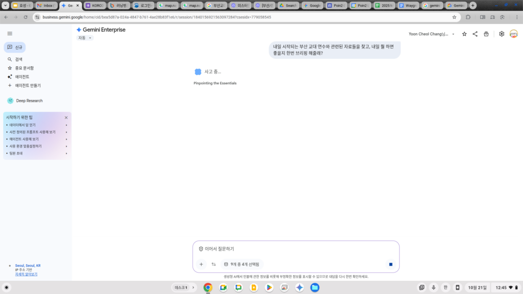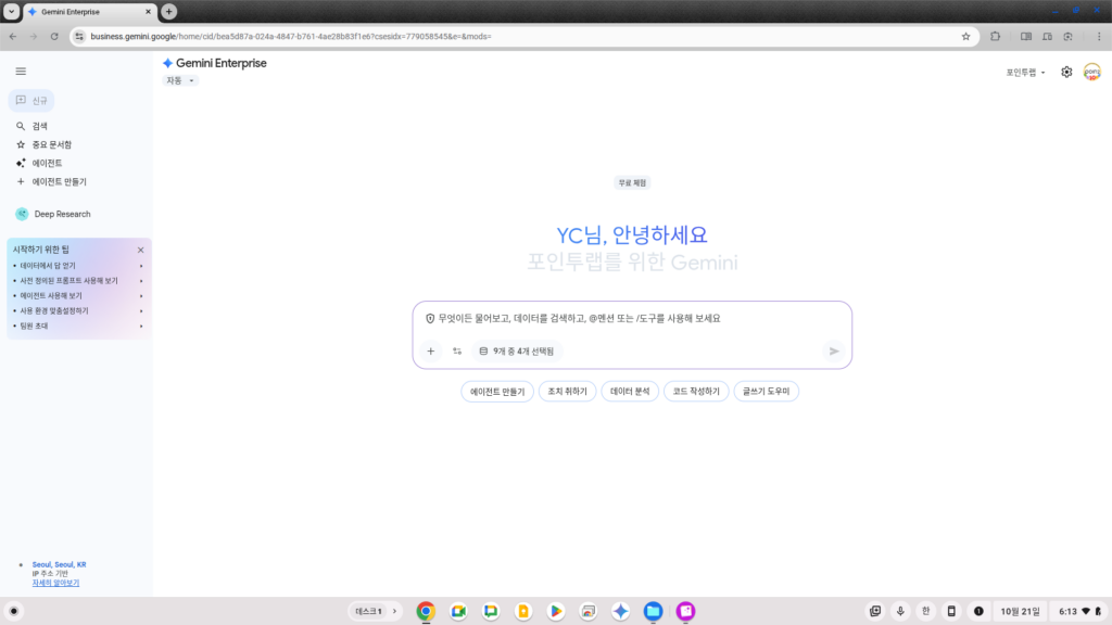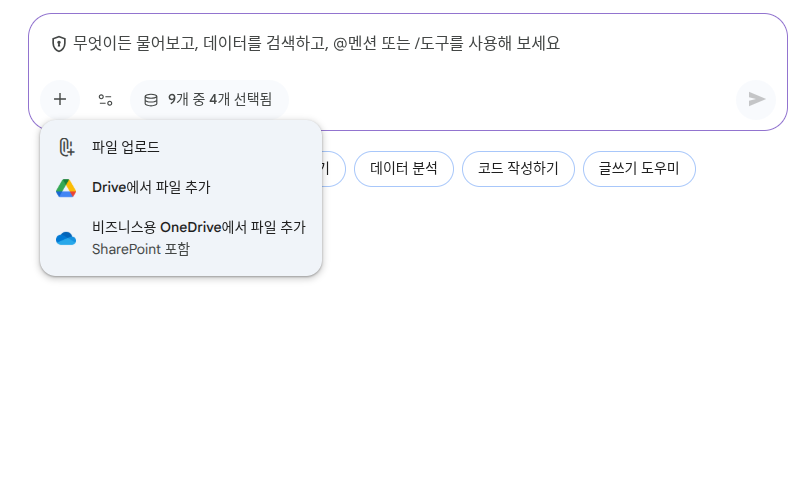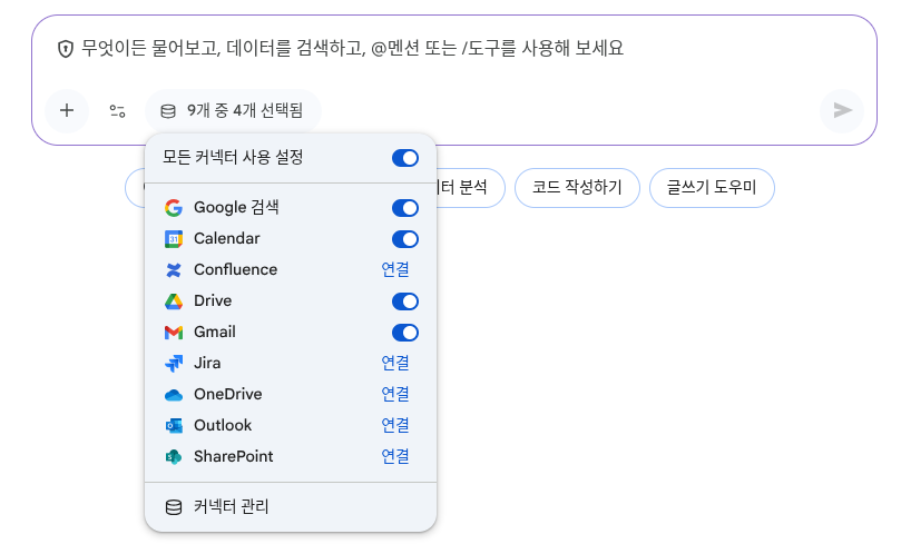 메인 챗 윈도우에서는 다음과 같이 어떤 커넥터의 데이터를 연동할지, 그리고 Gemini가 제공하는 어떤 에이전트와 소스를 사용할지 쉽게 선택하는 메뉴가 제공됩니다.
