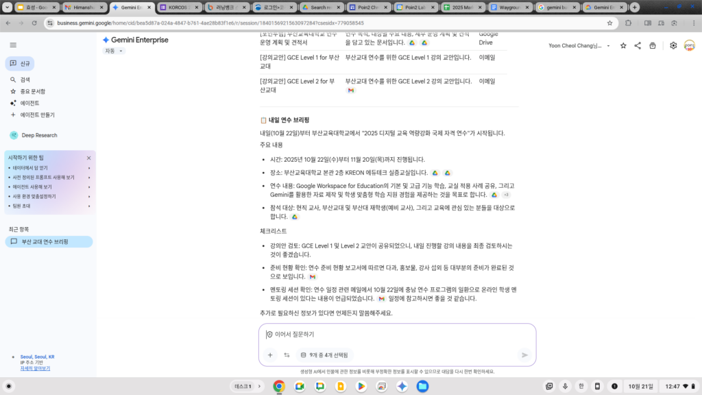 간단하게 질문을 던져보았는데요, 제가 내일 일정에 대해 무엇을 준비해야 할지 물어보니 제 업무 Gmail과 캘린더, 드라이브 등의 커넥터를 통해 필요한 자료의 드라이브 링크를 찾아주고, 어떤 일정들이 있는지 정말 저와 밀접하게 일하는 비서의 역할을 충실히 해주는 것을 볼 수 있었습니다.