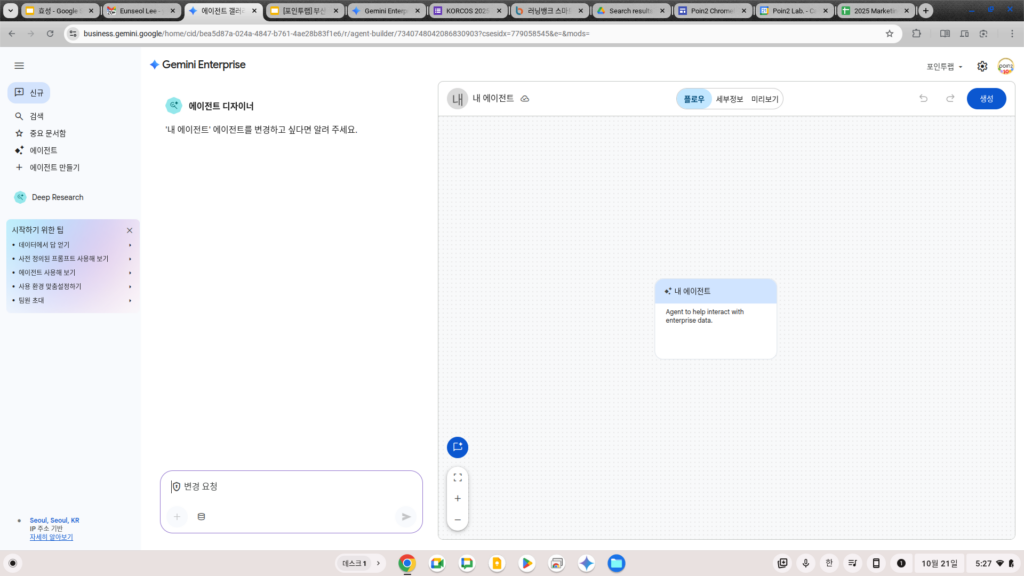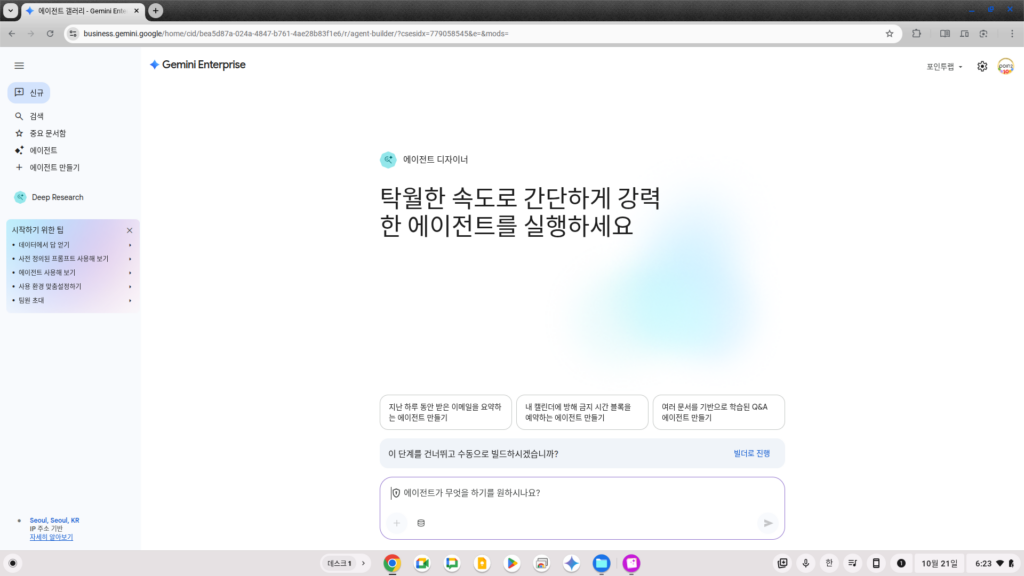 화면 좌측의 메뉴에는 이렇게 Agent에 대한 메뉴가 두가지 들어있습니다. 구글에서 제공하는 에이전트를 바로 갖다 사용할 수도 있고, 에이전트 디자이너를 통해 내게 필요한 에이전트를 쉽게 빌드할 수도 있습니다.