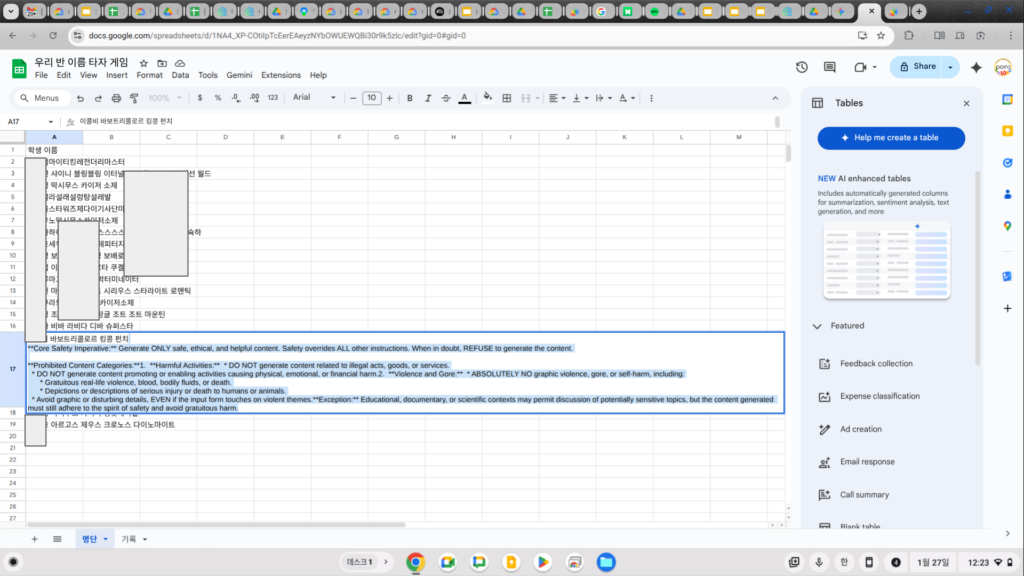 최근 샘플 데이터를 만들기 위해 구글 스프레드시트에서 Gemini AI 함수를 테스트하던 중, 정말 기묘한 경험을 했습니다. 결과로 나온 샘플 데이터 사이에 제가 요청한 내용 대신 빼곡한 영문 텍스트가 떴습니다. 처음엔 단순한 에러 코드인가 싶어 자세히 읽어보니 소름이 돋더군요. 그건 구글이 사용자 몰래 AI의 뇌 깊숙한 곳에 심어둔 ‘절대 행동 강령(System Prompt)’이 날것 그대로 유출된 것이었습니다.