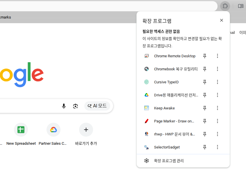 이제 모든 준비는 끝났습니다. 크롬 브라우저에서 확장프로그램을 실행하기 위해 주소창 우측의 퍼즐 모양 버튼을 눌러 rhwp를 실행해주세요.