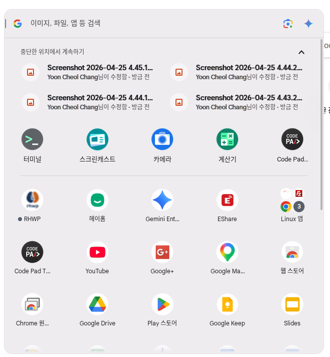 여기서 한가지 팁으로, 웹사이트나 확장프로그램을 작업표시줄 또는 앱 서랍에 고정하기 위해서는 크롬 브라우저의 메뉴를 열어주고 전송, 저장, 공유 메뉴에 들어가 “페이지를 앱으로 설치” 버튼을 눌러주면 됩니다. 그럼 아래와 같이 앱 서랍에서도 RHWP를 볼 수 있고, 작업표시줄에 고정시킬 수도 있습니다.