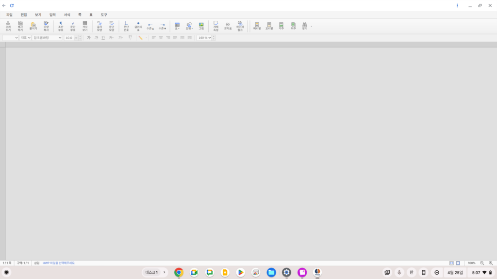 그럼 짜잔! 이렇게 에디터가 실행되고, 파일 메뉴를 통해 원하는 문서를 열고 편집할 수 있습니다. 현재는 hwpx 파일도 hwp로 저장만 지원된다고 하는데 추후 업데이트가 기대됩니다.